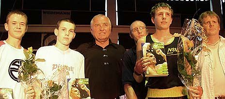 Ulli Wegner zeichnete im Ring die derzeit erfolgreichsten Nordhäuser Nachwuchstrainer aus: Tom Langelotz, Felix Lamm und Kai Döpping bekamen von Wegner für ihre Erfolge bei den Deutschen Meisterschaften der Kadetten einen Blumenstrauß und eine Buch von Sven Ottke. Einen Extra-Glückwunsch gab es für Tom, der sich für die Europa-Meisterschaften qualifiziert hatte.
