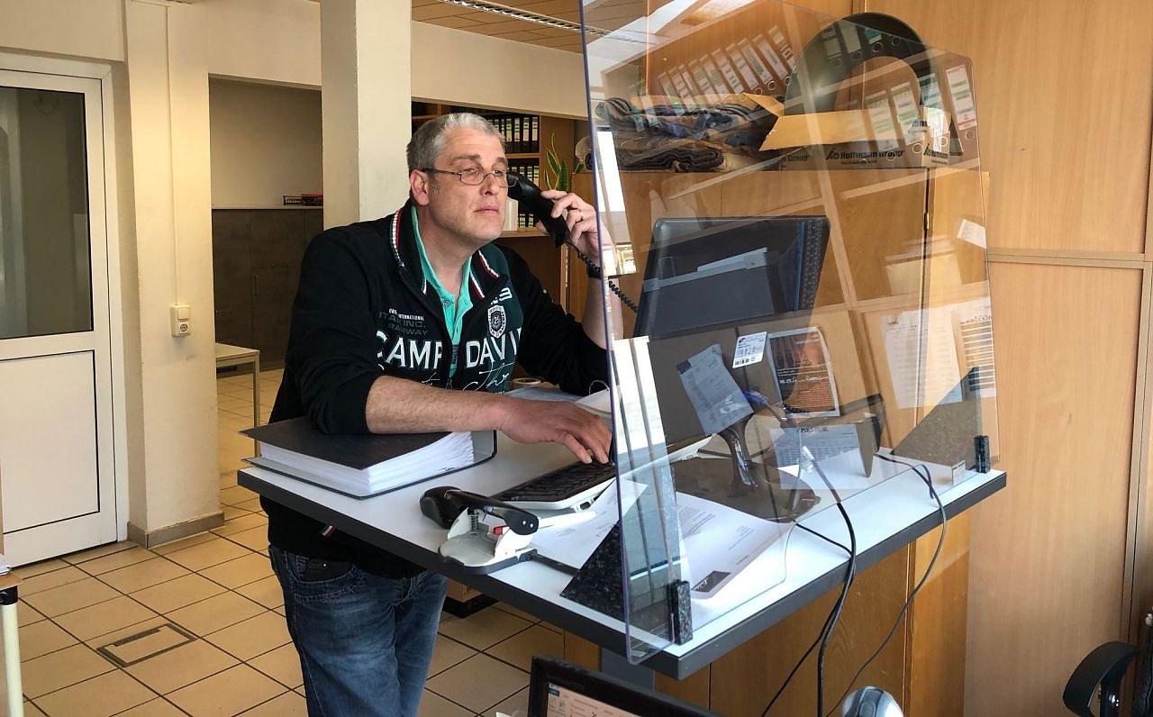 Vertriebsleiter Matthias Scharf zeigt eine Variante der Spuckschutz-Lösungen.