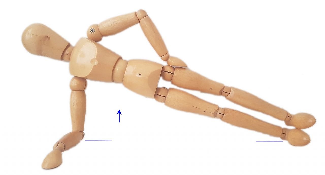Der Ellenbogen wird unter der Schulter positioniert und der ganze Körper angespannt. Die Spannung wird 30 Sekunden gehalten, dann wird die Seite gewechselt. Die Übung wird in zwei Sätzen jeweils zehn mal wiederholt und trainiert die seitliche Rumpfmuskulatur