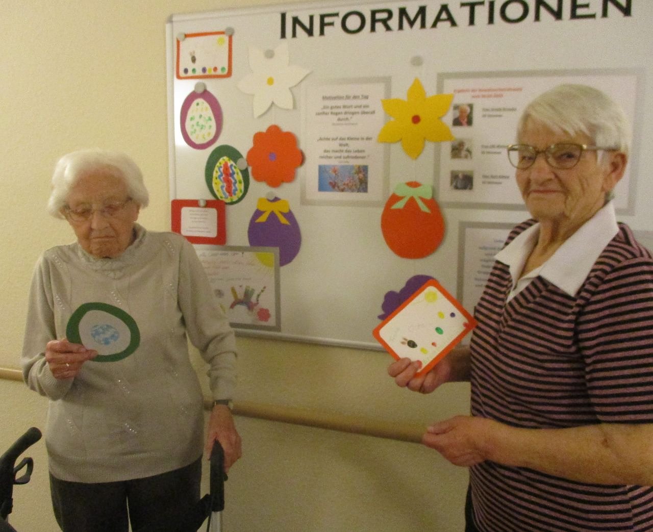 Pflegedienstleiterin, Frau Kuhnhardt, verwöhnt die Bewohner unter anderem mit formschönen Föhnfrisuren. Die Betreuungskräfte begleiten die Bewohner in den Hausgarten, gestalten Osterdekorationen und bringen Frühlingsblumen ins Haus. Das Pflegepersonal umsorgt liebevoll alle Bewohner, und das Servicepersonal gestaltet schmackhafte Frühstücks- und Abendbuffets.
