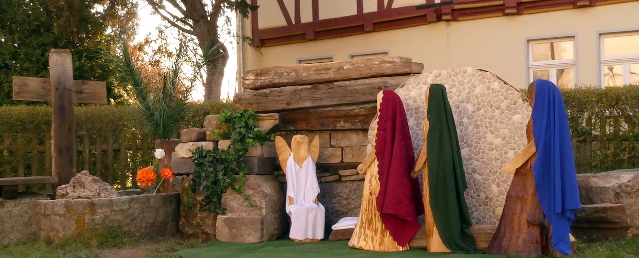 Etwas Neues hat sich auch die Gemeinde in Nordhausen Salza mit Pfarrer Hänel einfallen lassen. Sie haben ein großes Ostergrab auf dem Kirchplatz aufgebaut. Noch ist das Grab verschlossen, doch zu Ostern wird es offen sein und die Frauen sowie der Engel figürlich anwesend. Bei einem Spaziergang ist es schon von Weitem gut zu sehen.