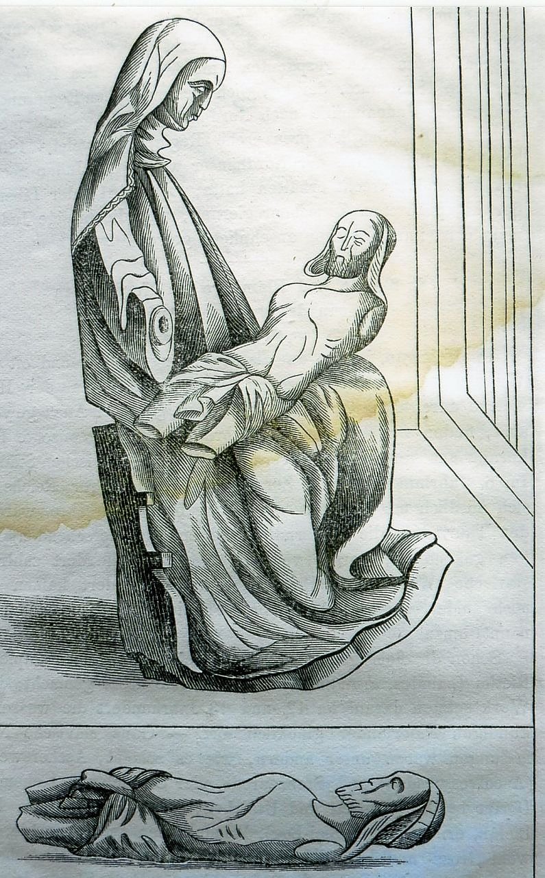Das ganz in der Nähe von Windehausen gelegene Kloster Himmelgarten fühlte sich ja auch der Schmerzensmutter verpflichtet, wie es uns der überlieferte Einblattdruck dieser Figurengruppe aufzeigt. Dort hält die Trauernde ihren Sohn im rechten Arm, wie es auf der Mehrzahl der Vesperbilder üblich ist. Anders geschieht es in der aus Lindenholz geschnitzten Figur in Windehausen, die vor ca. 700 Jahren entstand, wie es weiter unten beschrieben wird.