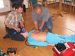 Direkt in der ersten Woche startete dann auch der Schulungsbetrieb in Sülzhayn mit einer intensiven Weiterbildung für Rettungsdienstpersonal: Insgesamt mehr als dreißig Rettungssanitäter und –Assistenten nahmen in der vergangenen Wochen an der Weiterbildung zum Thema Cardio-Pulmonale-Reanimation mit präklinischem Atemwegsmanagement teil. In dieser Veranstaltung wurden die erweiterten lebensrettenden Maßnahmen an Modellen geübt. Gastredner der Veranstaltung war Prof. Dr. med. habil. Uwe Klein, Chefarzt der Klinik für Anästhesie und operative Intensivmedizin am Südharzkrankenhaus Nordhausen. Prof. Klein erläuterte den Rettungsdienstlern, welche Möglichkeiten der Atemwegssicherung in Notfällen das Leben ihrer Patienten retten könnten. Im Anschluss an die Ausführungen des Prof. Klein referierte Andreas Pröger aus Plauen über den Ablauf einer Herz-Lungen-Wiederbelebung nach Richtlinien des European Resuscitation Councils, bevor die Teilnehmer die Gelegenheit hatten, dass bereits Erlernte an mehreren Modellen mit moderner Videoüberwachung und –Evaluation in die Tat umzusetzen.