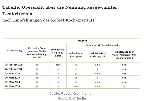 Zudem hat sich auch auf Bundesebene die Teststrategie im Verlauf der Zeit geändert. Die Empfehlungen des Robert Koch-Instituts bezüglich einer diagnostischen Abklärung von COVID-19 wurden zwischen Mitte Februar und Ende März mehrfach aktualisiert (Tabelle). Durch die Aktualisierungen der Testkriterien ändert sich bei vielen Subgruppen in der Bevölkerung die Wahrscheinlichkeit einer Testung. Der Grund für diese Aktualisierungen liegt sicherlich in der dynamischen Entwicklung der Epidemie. Die Absicht, begrenzte Testressourcen optimal zu verteilen, steht dann jedoch im Konflikt mit dem Ziel, Rückschlüsse auf die tatsächliche Infektionszahl zu treffen.