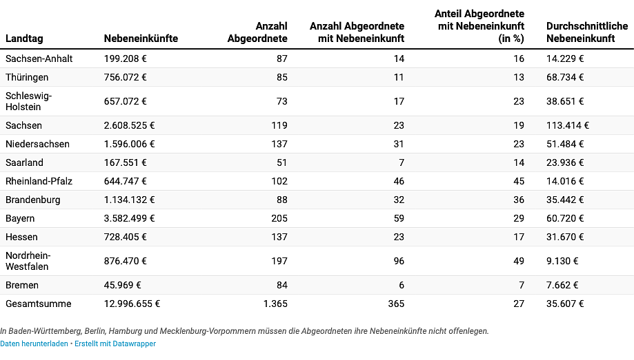 Von den übrigen zwölf Landtagen nehmen die bayerischen Abgeordneten insgesamt die höchsten jährlichen Nebeneinkünfte ein: Rund 3,6 Millionen Euro sind es insgesamt. Dahinter folgen die Landespolitiker aus Sachsen (2,3 Millionen Euro) und Niedersachsen (1,6 Millionen Euro). Am wenigsten verdienen die Abgeordneten in Sachsen-Anhalt (199.208 Euro), dem Saarland (167.551 Euro) und Bremen (45.969) nebenher.