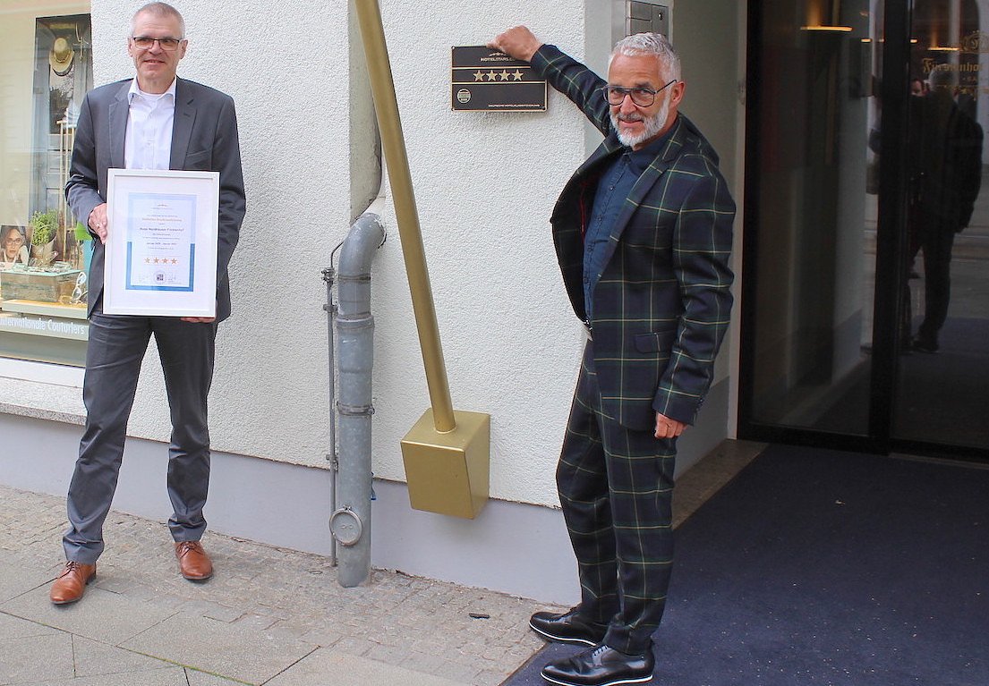 DEHOGA-Chef Ellinger mit der Urkunde, Hotelbesitzer Heck mit dem sichtbaren Resultat der Zertifizierung