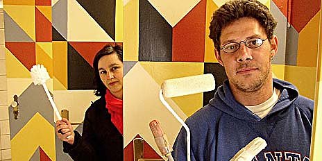 Die Besucher dürften überrascht sein: Statt grauer Sanitär-Tristesse dominiert Farbigkeit. Kulturamtsmitarbeiter Enrico Bollmann (vorn) hat die Eingangs- und Toilettentüren nach den Ideen der Schüler der Jugendkunstschule um Kunigunde Berberich (hinten) völlig neu gestaltet. Darüber hinaus wurden auch die Wände frisch gemalert, gespachtelt und einzelne Fließen ausgebessert. Betrieben wir die Toilette vom Kulturamt der Stadt Nordhausen mit Unterstützung von Aushilfskräften bzw. ehrenamtlichen Helferinnen. Dank deren Einsatz kann die Toilette täglich von 10 – bis 18 Uhr öffnen.