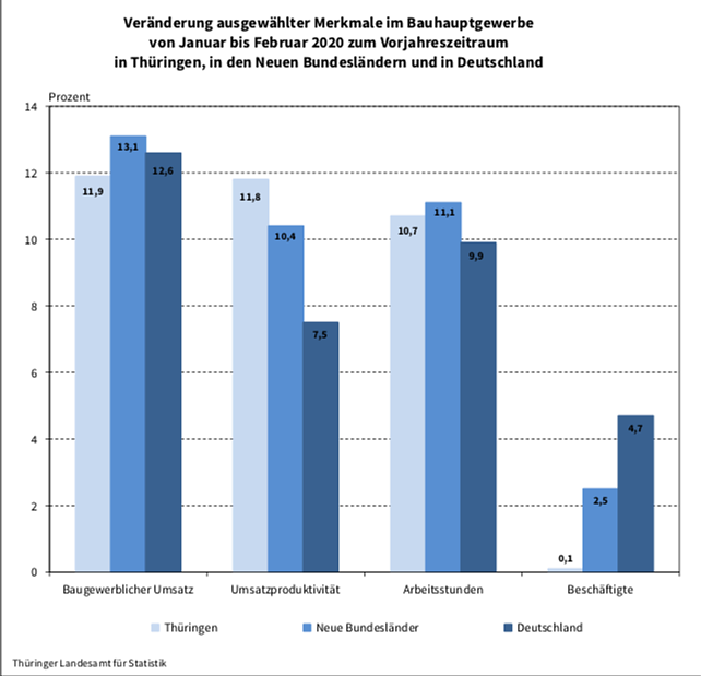 Nach den ersten zwei Monaten 2020 lagen die Betriebe des Thüringer Bauhauptgewerbes mit im Allgemeinen 20 und mehr Beschäftigten damit um 1,2 Prozentpunkte unter dem Durchschnitt der neuen Bundesländer und 0,7 Prozentpunkte unter dem Bundesdurchschnitt.