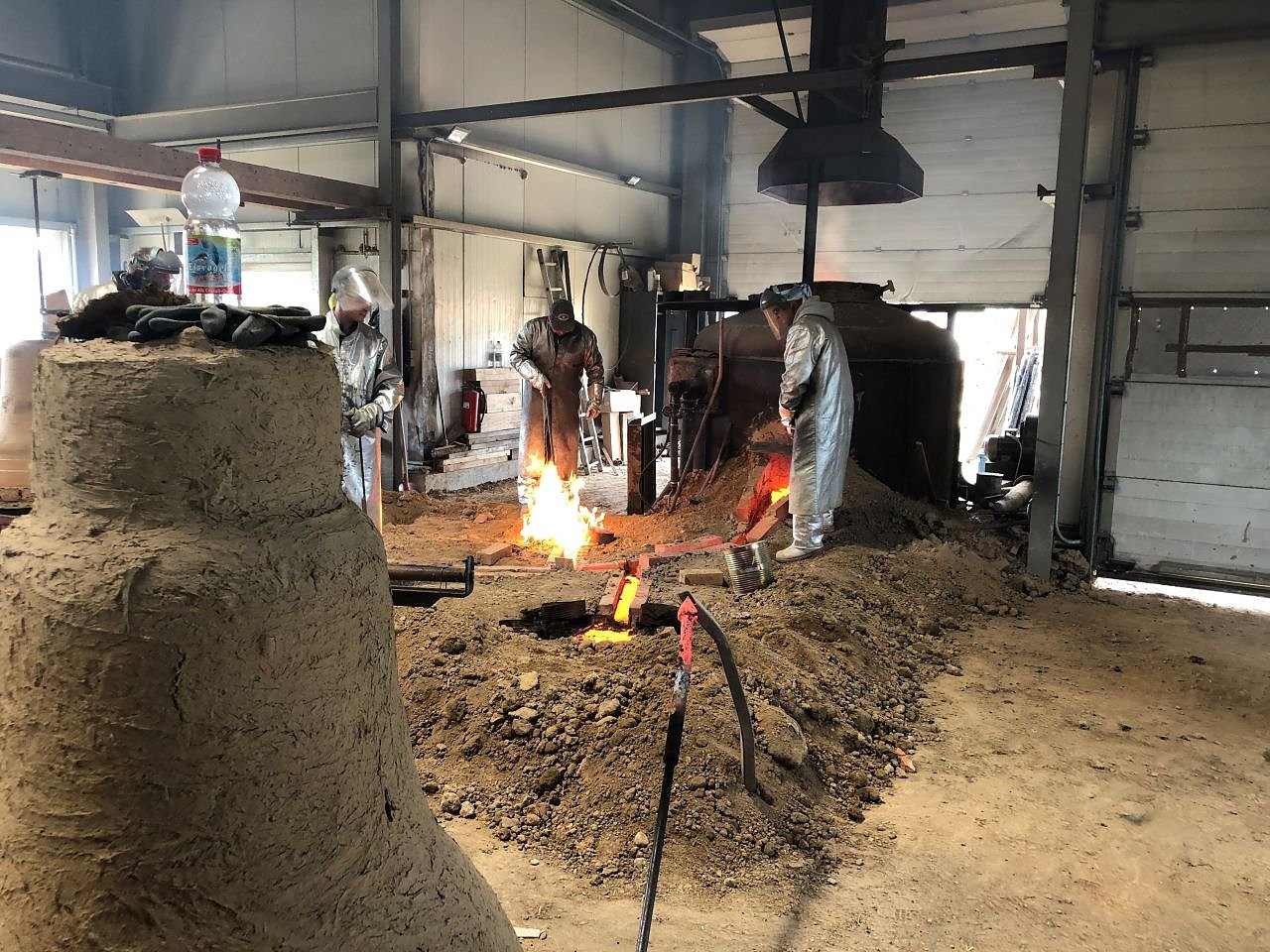 Acht Menschen stehen zusammen und wurden gerade Zeuge eines Wunders. 7.000kg flüssiges Metall über 1000°C heiß liefen über Gänge im aufgeschütteten Gießhügel: aus dem Schmelzofen direkt in die Glockenformen, die in sechs Metern Tiefe in einer Grube vergraben sind...