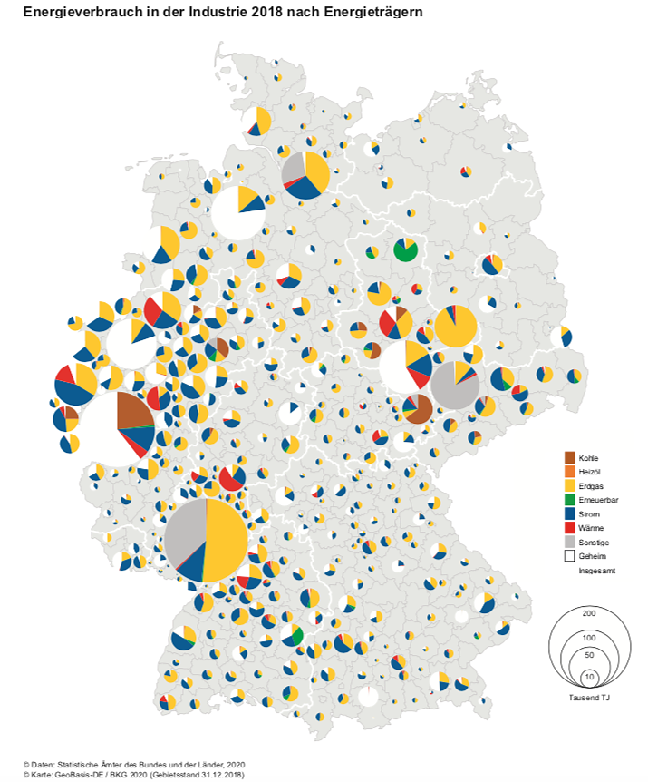 Für die Landkreise bzw. kreisfreien Städte Deutschlands wird mit einem Kreis-Sektoren-Diagramm (Tortendiagramm) der Energieverbrauch – energetische und nichtenergetische Nutzung von Energieträgern – detailliert nach den Energieträgern Kohle, Erdgas, Heizöl, erneuerbare Energien, Strom, Wärme sowie sonstige Energieträger grafisch dargestellt. Nichtenergetische Nutzung liegt vor, wenn z. B. Energieträger als Rohstoffe für chemische Prozesse eingesetzt werden. Wird für den Energieverbrauch eines Stadt- oder Landkreises kein Tortendiagramm gezeichnet bzw. werden weiße Sektoren angezeigt, unterliegt der Gesamtwert bzw. Teilwert der statistischen Geheimhaltung.