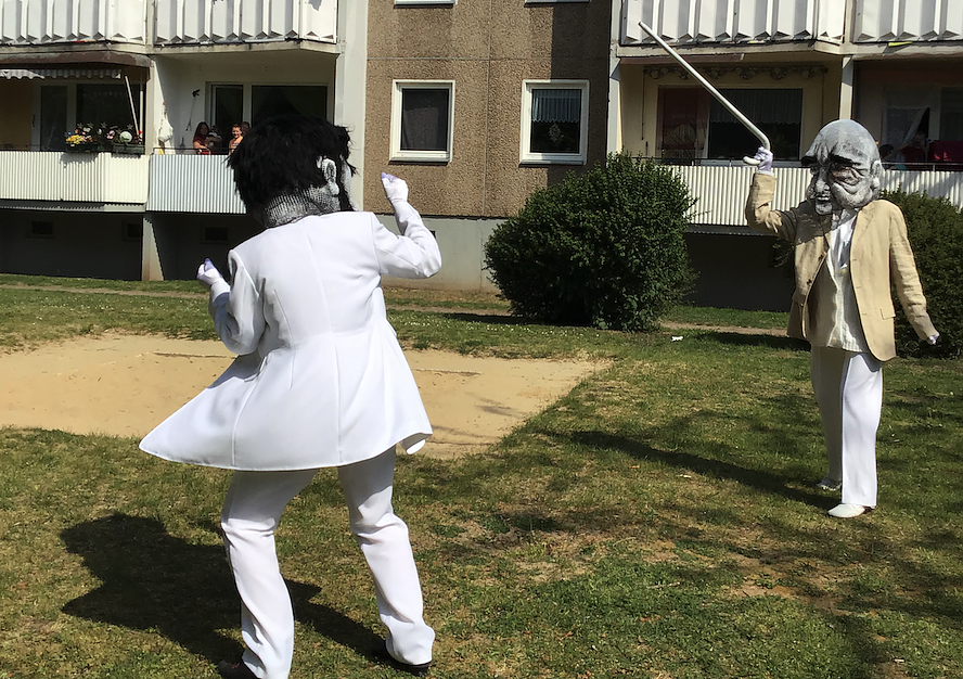 Mit dem Zirkus Zappelini und dem jungen Theater fanden sich schnell nicht nur zwei Institutionen die das nötige Know-How mitbringen, sondern auch begeisterte Mitstreiter, die gerne die Chance beim Schopfe packten, wieder vor Publikum spielen zu können. Letzteres fand sich in der vergangenen Woche auf Balkonen und hinter Fensterscheiben in Salza. Steffi Böttcher vom Zirkus Zappelini hatte die nötigen Requisiten mitgebracht: große Tücher, Jonglage-Keulen, bunte Bälle, ein kleines, maskiertes Maskottchen und treibende, musikalische Untermalung - alles Dinge, die man auch aus der Ferne sehen und hören kann.