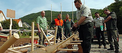 Der Parcours für die Waldarbeitermeisterschaft ist vorbereitet. Am Ilfelder Bahnhof werden Starter aus Thüringen, Sachsen-Anhalt und Niedersachsen gegeneinander sägen. Die acht Auszubildenden des Forstamt Ilfeld hatten bei den schon zwei Wochen dauernden Vorbereitungen kräftig mit angepackt. Zur Belohnung durften sie heute schon mal testweise auf die Strecke. Fünf der jungen Männer treten am Sonntag mit Axt und Motorsäge an. Die Konkurrenz schläft nicht, aber wir haben bei Harzfesten bisher immer sehr gut abgeschnitten. macht Ausbilder Lutz Kohlmann den Jungs Mut. Beim zweiten Harzfest in Thüringen 2002 in Neustadt gewann Steffen Bruns vom Forstamt Ilfeld in der Jugendklasse. Damit es gerecht zugeht, wird in Auszubildende und Erwachsene unterteilt. Dank der Sponsoren Stihl und Dolmar gibt’s für beide Erstplazierten eine Motorsäge. Ein echter Ansporn für die Lehrlinge. meint Kohlmann. Nicht nur aus Ilfeld, auch aus Buchholz, Sülzhayn und Hohenebra kommen die Thüringer Teilnehmer. Unternehmen aus der Region unterstützen den Wettbewerb mit Preisen und bei der Vorbereitung.