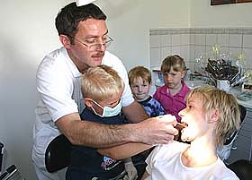 Elf Kinder und zwei Erzieherinnen machten sich ,mit der Combino Duo auf den Weg nach Ilfeld um ihrem Patenschaftszahnarzt einmal bei seiner Arbeit über die Schulter zu schauen. In der Praxis angekommen wurde erst einmal alles genau in Augenschein genommen. Geduldig und mit viel Humor erklärte Dr. Bäßler den Kindern alle Instrumente und Geräte in seiner Praxis. Nach all den Erklärungen war es für die Kinder Zeit selbst aktiv zu werden. Gemeinsam mit ihrem Patenschaftszahnarzt machten sie einen kranken Zahn wieder gesund und zogen mit Hilfe einer echten Zahnarztzange einem unechten Gebiss ein paar Zähne. Als Höhepunkt des Besuches hatte sich Dr. Bäßler etwas ganz Besonderes für seine kleinen Gäste ausgedacht. Die Kinder durften selbst einmal Doktor spielen und dem Zahnarzt und seiner Helferin gehörig auf den Zahn fühlen.