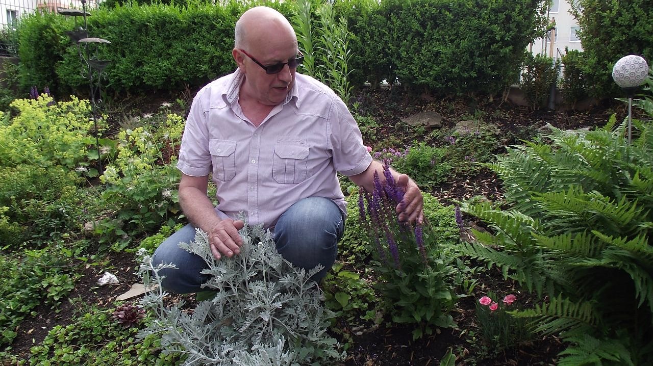Bernd Telemann auf der Hang-Rabatte hinter seiner Wohnung in der Weberstraße 25. (Foto: Kurt Frank)