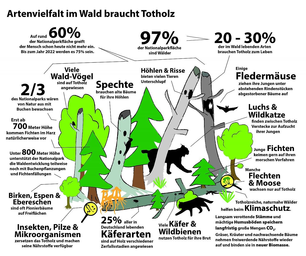 Bitte beachten Sie aber das Wegegebot im Nationalpark – die offiziellen Wanderwege dürfen zum Schutz der Natur nicht verlassen werden. Diese Regel gilt auch in den Naturschutzgebieten. Aber insbesondere der faszinierende Waldwandel und auch manche Pflanze sind vom Weg aus zu beobachten und zu fotografieren, so der im Nationalpark Harz ehrenamtlich aktive Waldführer und Fotograf Wilfried Störmer.