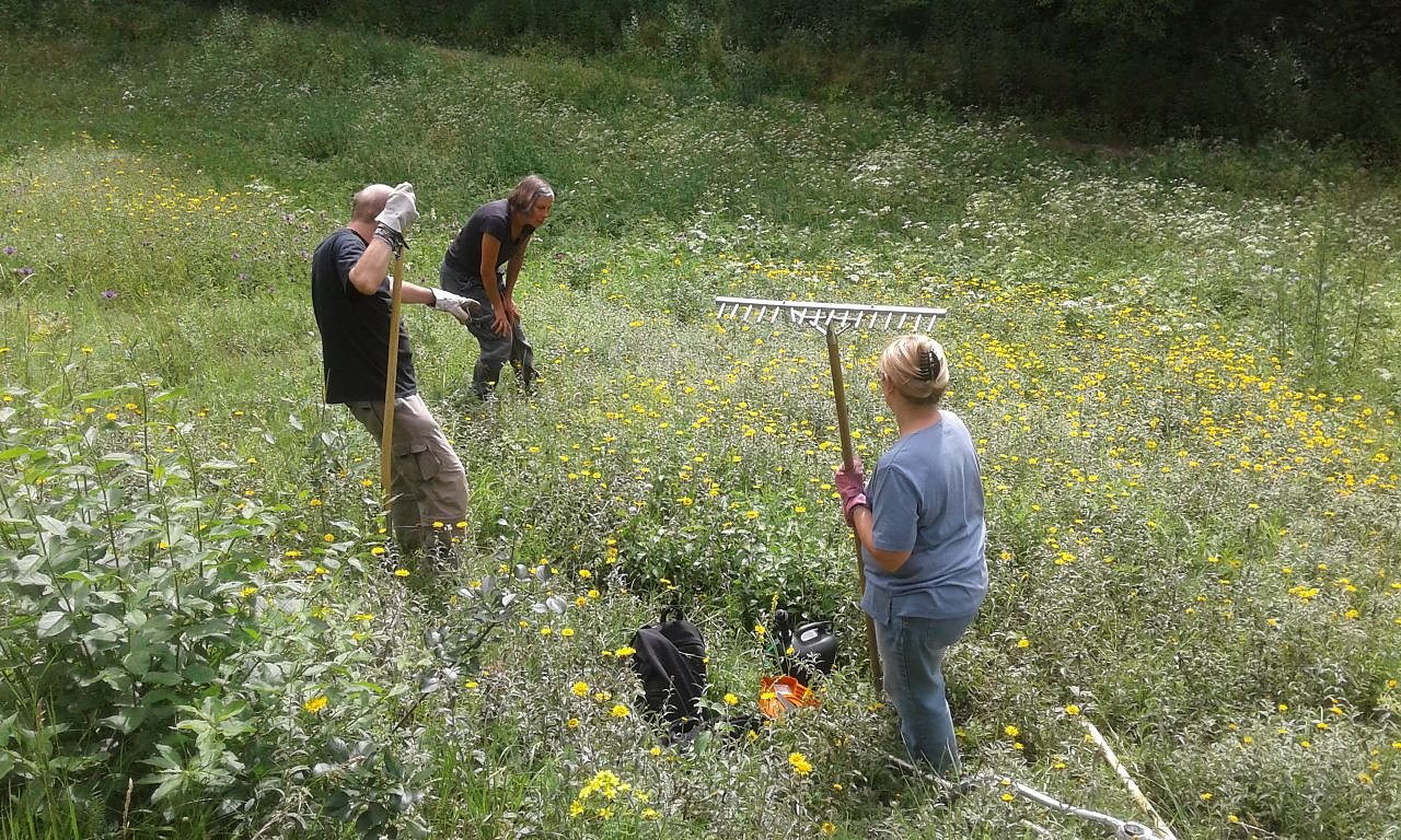 Der durch den Nachweis eines massiven Insektensterbens berühmt gewordene Krefelder Entomologische Verein, der mit vergleichenden, über Jahrzehnte praktizierten Untersuchungen einen Rückgang der Insekten-Biomasse in einem großen Gebiet in geradezu dramatischen Größenordnungen erkannt hatte, hat in gewisser Weise auch unsere Pflegeeinsätze erreicht: Obwohl dies den zeitlichen Aufwand noch einmal beträchtlich erhöht, mähen wir bei Einsätzen vor August immer größere Teile unserer Trocken- und Halbtrockenrasen zunächst nicht. Die Larven verschiedenster Insektenarten sind auf intakte oberirdische Pflanzenteile für die erfolgreiche Vollendung ihres Lebenszyklus' angewiesen.