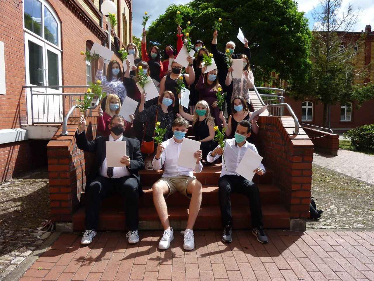Pompös war die diesjährige feierliche Verabschiedung den Umständen geschuldet nicht. Dennoch kamen die Abschiedsgrüße des Schulleitungsgremiums und der Klassenleitung von Herzen. Den Schülerinnen und Schülern wurden neben vielen Glückwünschen auch ganz besondere Worte mit auf den Weg gegeben. Jede/-r Schüler/-in erhielt eine Karte mit persönlich formulierten Komplimenten von den Lehrkräften. Gestärkt mit diesem positiven Feedback werden die jungen Frauen und Männer nun ihren weiteren Weg bestreiten, für den Ihnen die Pädagogen alles Gute und viel Erfolg wünschen.