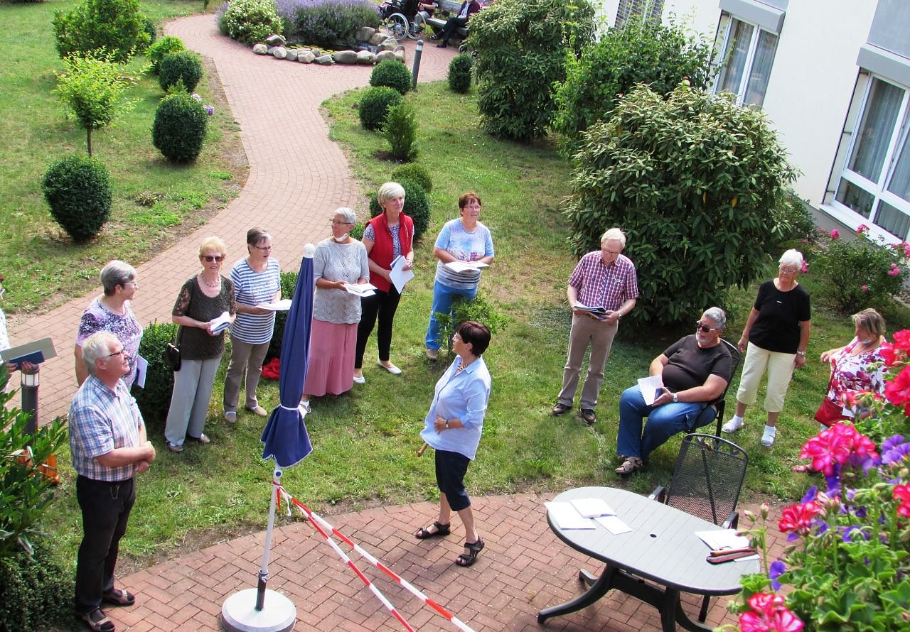 Der Chor hatte sich für das Konzert im Garten der Einrichtung versammelt. So konnten viele Senioren auf ihrem Balkon oder am Zimmerfenster sitzend dem Konzert bequem folgen und gleichzeitig den notwenigen Sicherheitsabstand wahren. Nach einem Grußwort von Pastor Dr. Bodo Seidel folgten viele erfrischend vorgetragene Volkslieder, regionale Heimatlieder und auch Kirchenlieder. Den Mitgliedern des Chors unter Leitung von Hildegard Seidel bereitete es sichtlich Freude, für die Senioren zu singen. Das übertrug sich auf die Zuhörer und so wunderte es nicht, dass viele in die ihnen kannten Lieder mit einstimmten.