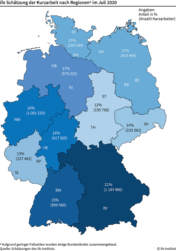 In Baden-Württemberg waren es 19 Prozent oder 900.000 Menschen. Niedersachsen und Bremen kamen auf 17 Prozent oder 580.000 Menschen. Gerade in den Ländern mit bedeutender Automobil- und Zuliefererindustrie wird besonders viel Kurzarbeit gefahren, sagt ifo-Arbeitsmarkt-Experte Sebastian Link.