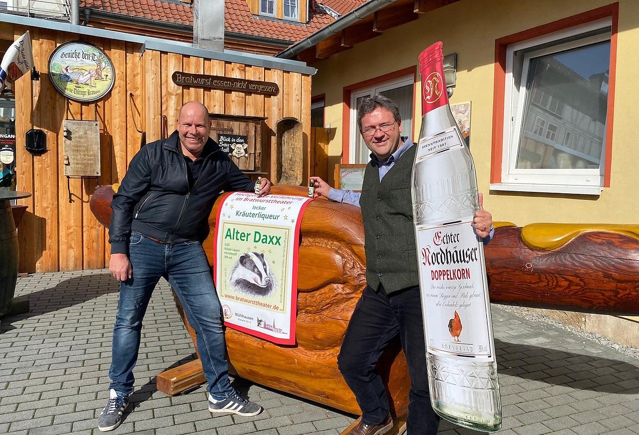 Die beiden Museumsleiter, Thomas Mäuer vom Bratwurstmuseum und Thomas Müller von der Traditionsbrennerei, besiegelten am Freitag die Kooperation mit einer ersten Zusammenarbeit. So füllen die Nordhäuser künftig einen exklusiven Kräuter nur für die Mühlhäuser ab – den sogenannten Alten Daxx. Das Schnäpschen ist eng verbunden mit dem Bratwurst-Theater, das im Oktober wieder geöffnet wird. Der Kartenvorverkauf hat begonnen.