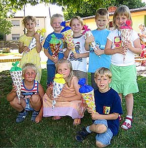 Neben dem Puppentheater gab es noch andere Überraschungen für die Kinder an diesem Tag. Natürlich bekam jedes Kind eine Zuckertüte, die Vorschulkinder eine große, die anderen eine kleinere. Zur Abkühlung an diesem sonnigen Tag gab es leckeres Eis und bei einer Tour durch Sundhausen auf dem Traktorhänger des Lanz-Bulldog-Clubs konnten sich die Kinder vom Fahrtwind erfrischen lassen. Alles in allem war dies ein wunderschöner, gelungener Tag, den vor allem auch die zukünftigen Schulkinder wohl so schnell nicht vergessen werden.
