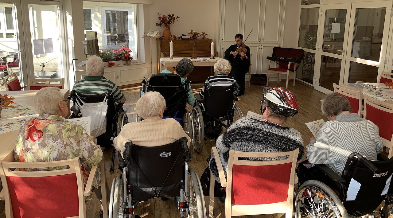 Seit Montag, dem 14. bzw. 21. September finden wieder im Sonnenstübchen nach monatelanger Corona-Pause die morgendlichen Andachten mit Pfarrer Heimrich sowie das traditionelle Singen am Klavier mit Musikpädagogin Gertrude Henze statt. Unter Mindestabstand, Handhygiene und Mund- Nasenschutz finden einige Highlights neben regulären Beschäftigungsrunden langsam wieder ihren Platz im Leben der Bewohner des Hauses. Was ab September mit Lockerungen in Bezug auf Besuche für Bewohner und Öffnungszeiten für das Seniorenpflegeheim Sonnenhof begann, geht nun in Runde 2, welches externe Gäste im Haus unter Einhaltung des Hygienekonzeptes willkommen heißt.