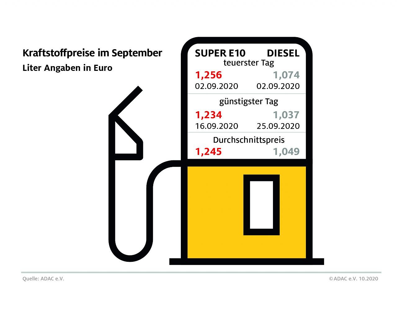 Am teuersten waren beide Kraftstoffsorten Anfang des Monats – bevor der Rückgang des Ölpreises einsetzte. Demnach kostete am 2. September Super E10 1,256 Euro je Liter, der durchschnittliche Dieselpreis lag bei 1,074 Euro. Am preiswertesten konnten die Fahrer von Benziner-Pkw am 16. September tanken mit 1,234 Euro je Liter, Diesel-Fahrer am 25. des Monats mit 1,037 Euro.
