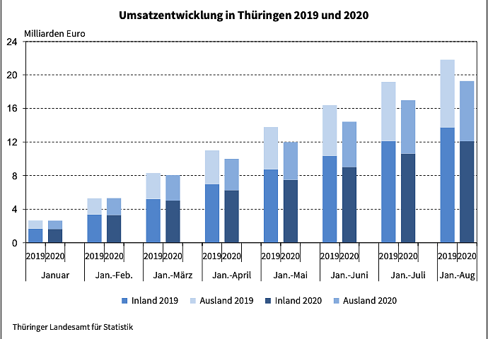 Die Thüringer Industrie erzielte in den ersten 8 Monaten 2020 rund 19,3 Milliarden Euro Umsatz. Wie das Thüringer Landesamt für Statistik mitteilt, lagen die Umsätze in den Industriebetrieben um 11,6 Prozent bzw. 2,5 Milliarden Euro unter dem Vorjahreszeitraum...