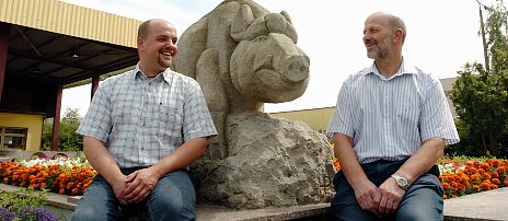 Vom ehemaligen LPG Großbetrieb mit Championzucht und Reithalle ist nicht mehr viel übrig. Einzig der Eber am Eingang, die Steinfigur eines Hallenser Künstlers, erinnert an alte Zeiten. Auf Mitarbeiter von damals, die den Betrieb genauestens kennen, will Henri van Asten aber nicht verzichten. Dr. Friedhelm Etzrodt, 34 Jahre als Betriebsleiter tätig, berät den holländischen Unternehmer. Er erinnert sich noch genau an die Zeiten, als rund 800 Menschen die Tiere versorgten. Inzwischen arbeiten nur noch 80 Leute hier. Davon sind es acht Lehrlinge, fünf kamen diesjahr neu hinzu. Drei Tierwirte, einen Feldwirt und eine Bürokauffrau wird man ausbilden. Die Chancen auf Übernahme sind sehr gut, man habe grade erst zwei ausgelernte Auszubildende eingestellt.