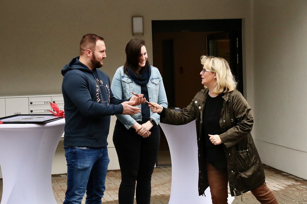 Symbolische Schlüsselübergabe: Christian und Steffi Müller gehören zu den ersten 15 Mietern der neuen Gebäude (Foto: agl)
