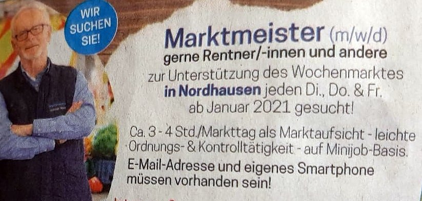 Vorzugsweise seien diese Marktleiterjob auf Minijob-Basis an Rentner zu vergeben, erläuterte Katrin Schiel, auf 450-Euro-Basis. Heute schon wolle sie sich mit "zwei oder drei Bewerbern" auf die inserierte Offerte treffen und fügte hinzu: "Das Beste wäre, sie würden von ihrem Fenster aus den Markt sehen", was allerdings scherzhaft gemeint war, jedoch zwingend erforderlich seien eine eigene Mail-Adresse und ein eigenes Smartphone, wie der obigen Anzeige zu entnehmen ist. Darüber hinaus werde auch Frau Schiel "öfter vor Ort" sein.