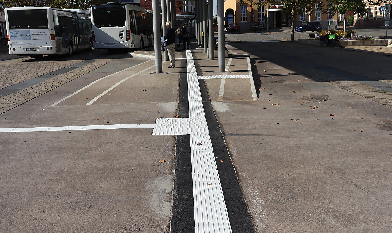 Herr S. ist blind, ein ordentliches Leitsystem liegt ihm entsprechend nah am Herzen. Die Bauarbeiten am Bahnhofsplatz hat er mit regem Interesse verfolgt. Im Oktober vergangenen Jahres hatte man damit begonnen, ein taktil wie visuell erfassbares Leitsystem in Form weißer Rillen- und Noppenplatten zu verlegen.
