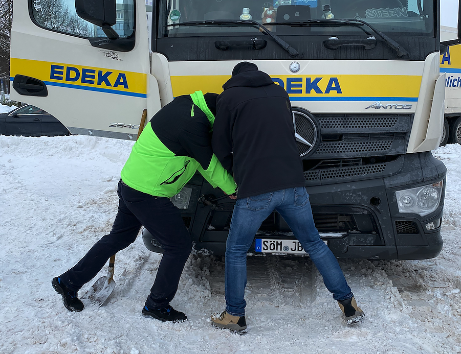 Beim Edeka-Fuchs hofft man derweil, dass es doch noch klappt. Bis heute morgen. In der Töpferstraße sprechen Kollegen mit Räumarbeiten beschäftigte Mitarbeiter der Stadt an, in der Hoffnung, dass sich doch noch rechtzeitig etwas bewegt. Aber: ohne entsprechenden Auftrag können die Kräfte vor Ort nicht aktiv werden, teilen die Arbeiter mit. Als Ausweichmöglichkeit bleibt der Bebelplatz, der war am Dienstag mit schwerem Gerät beräumt worden. Halb sechs gibt Graß diese Option an die Zentrale durch, der Lkw rückt an und steckt prompt fest. Das was ich befürchtet hatte ist dann eingetreten. Wir mussten dem THW Bescheid geben, das war nach fünf Minuten die erste Unterstützung da, das hat schnell funktioniert. Dann kam noch Herr Lier vom Autotuning und hat bei der Organisation geholfen. Gut anderthalb Stunden später kam schließlich das große Fahrzeug und konnte unseren Lkw freiziehen, berichtet die Marktchefin, die zwischenzeitlich mit Kollegen versucht hatte, den Laster per Schaufel vom Schnee zu befreien.