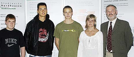 Seit mehreren Jahren bilden die Unternehmen der Stadtwerke-Nordhausen-Gruppe junge Leute in verschiedenen Berufen aus. Mitte August begrüßte der Personalleiter der Stadtwerke, Bodo Hempel, die neuen Auszubildenden Marco Weißkopf, Mathias Lange, Markus Kiel und Franziska Bernsdorf (v. l. n. r.). "Wir haben uns entschlossen, auch in diesem Jahr wieder vier Ausbildungsplätze zur Verfügung zu stellen. Die Jugendlichen werden zur Fachkraft im Fahrbetrieb, zum Fachangestellter für Bäderbetriebe, zur Fachkraft für Kreislauf- und Abfallwirtschaft sowie zur Bürokauffrau ausgebildet", so Bodo Hempel.