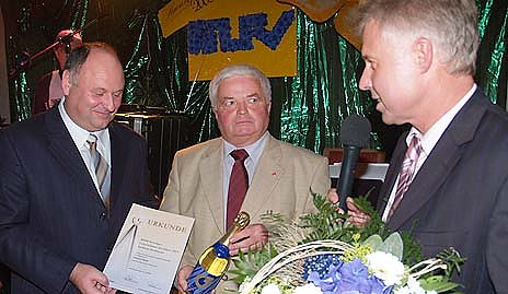 Bevor es zum Büffet ging wurde noch ein Unternehmer aus dem Landkreis Nordhausen zum Unternehmer des Jahres gekürt. Volker Beiersdorf vom Verband der mittelständischen Wirtschaft überreichte Helmut Peter die Urkunde für sein Engagement in der Wirtschaft, aber auch für die Region. Künstler des Nordhäuser Theaters bereicherten den Abend mit einem anspruchsvollen Programm, das schließlich noch durch einen Überraschungsgast gekrönt wurde. Exakt um Mitternacht erschien. Der Schauspieler Dieter Bellmann alias Prof.Simoni aus der TV-Serie "Die Sachsenklinik" begrüßte die Gäste des Sommerfestes und ließ sich den Echten Nordhäuser schmecken.