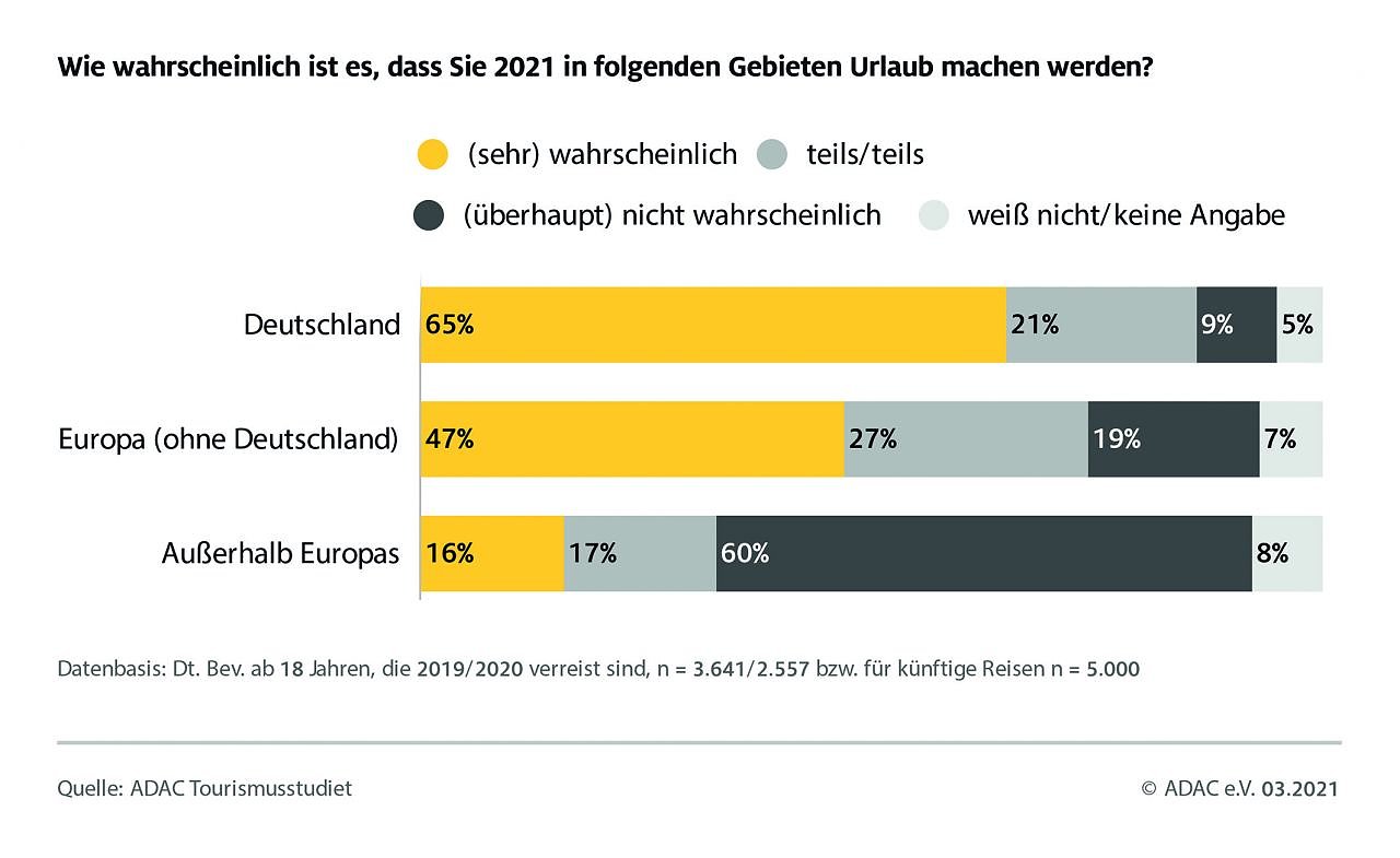 Ein weiteres Ergebnis der ADAC Studie: Deutschland wird als Reiseziel auch 2021 wieder im Fokus stehen. Knapp zwei Drittel der Deutschen wollen demnach auch in diesem Jahr hierzulande Urlaub machen, etwas weniger als die Hälfte strebt ins europäische Ausland und nur 16 Prozent zieht es an Ziele außerhalb Europas. Deutschland dürfte mittelfristig sogar noch beliebter werden. Wie die Umfrage zeigt, hat Deutschland auch mittelfristig vor den anderen europäischen und vor allem den außereuropäischen Ländern als Reiseziel klar die Nase vorn.