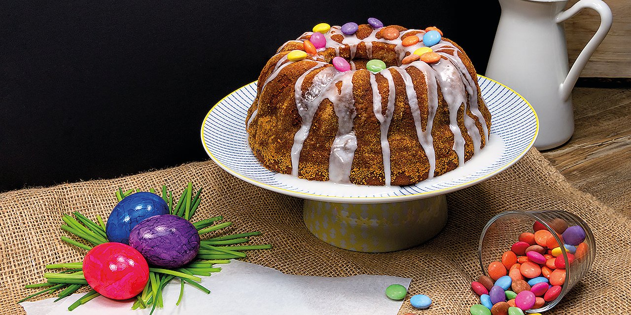 Wenn der Kuchen fertig und gut abgekühlt ist, kann ein Zuckerguss aus Puderzucker und Zitronensaft zubereitet und über den Kartoffel-Karotten-Gugelhupf gegossen werden. Jetzt folgt der größte Spaß für die Kinder: das Dekorieren. Hier sind der Fantasie keine Grenzen gesetzt. Ob Marzipan-Hasen, Schokolinsen, Streusel oder Schoko-Ostereier – erlaubt ist, was schmeckt.