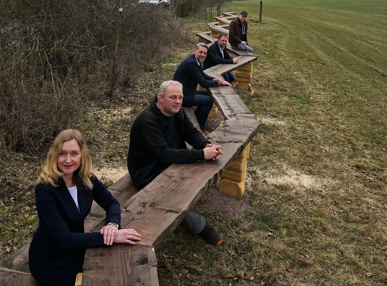 Kultur- und Tourismusausschussvorsitzende Jeanette Goedecke, Harztorbürgermeister Stephan Klante, Mario Eckhardt, Formula-Chef Elmar Zimmer und Landwirt Steffen Peix an der 30,5 Meter langen Sitzbank zwischen Harzungen und Niedersachswerfen. (Foto: S. Schedwill)