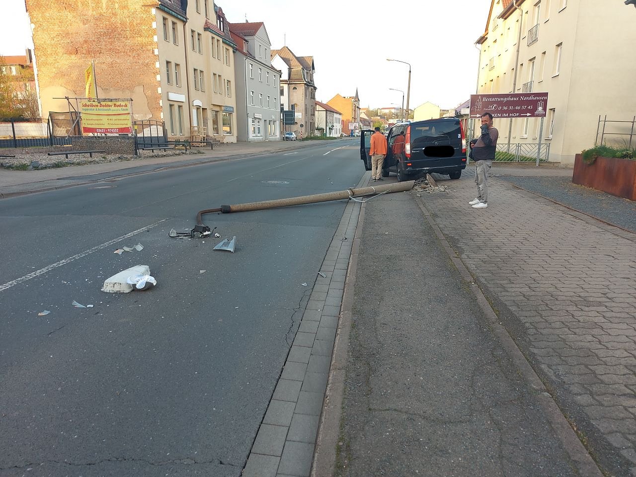 Gemeinsam mit einem Mitarbeiter der Stadtbeleuchtung Nordhausen wurde die Unfallstelle gesichert. Glück im Unglück, es kam gerade kein Fahrzeug auf der sonst so viel befahrenen Straße.
