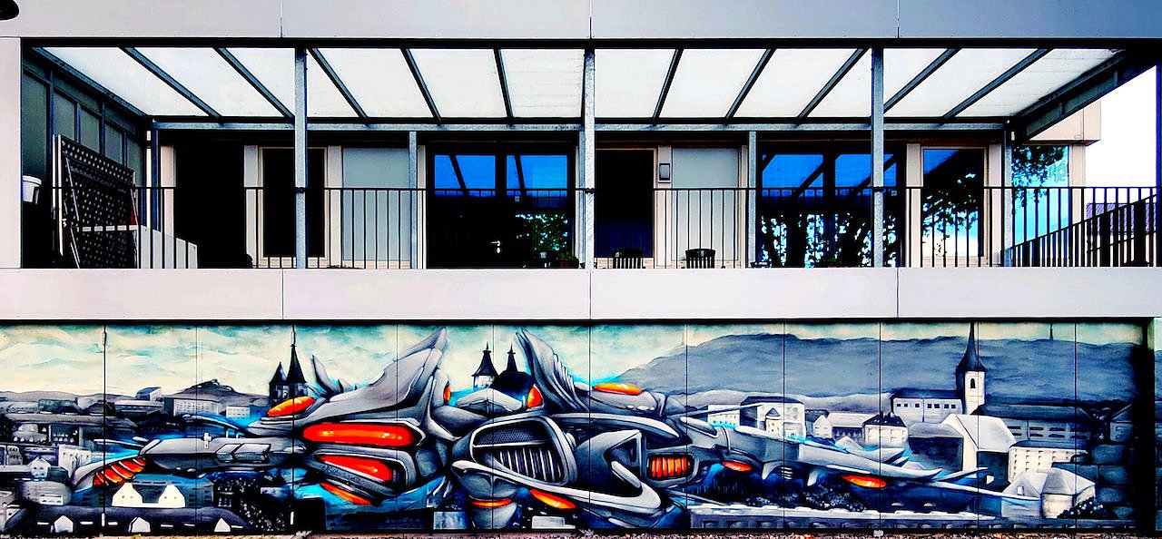 Der Blickwinkel über das Cockpit eines Motorrads auf die Silhouette der Stadt mag dem Betrachter gefallen oder nicht, ein Hingucker ist die Arbeit allemal. Und das gewollte Bild hält andere "Künstler" vielleicht davon ab "UN14" oder ähnliche kryptische Botschaften an die Wand zu sprühen.