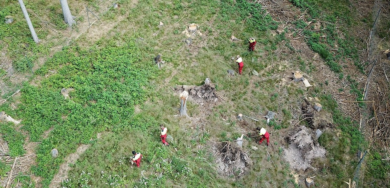 Forstwirte der Landesforstanstalt bepflanzen eine, zum Schutz vor Wildverbiss umzäunte, Schadfläche im Thüringer Forstamt Leinefelde mit Laubholz (Foto: Rolan Stein)