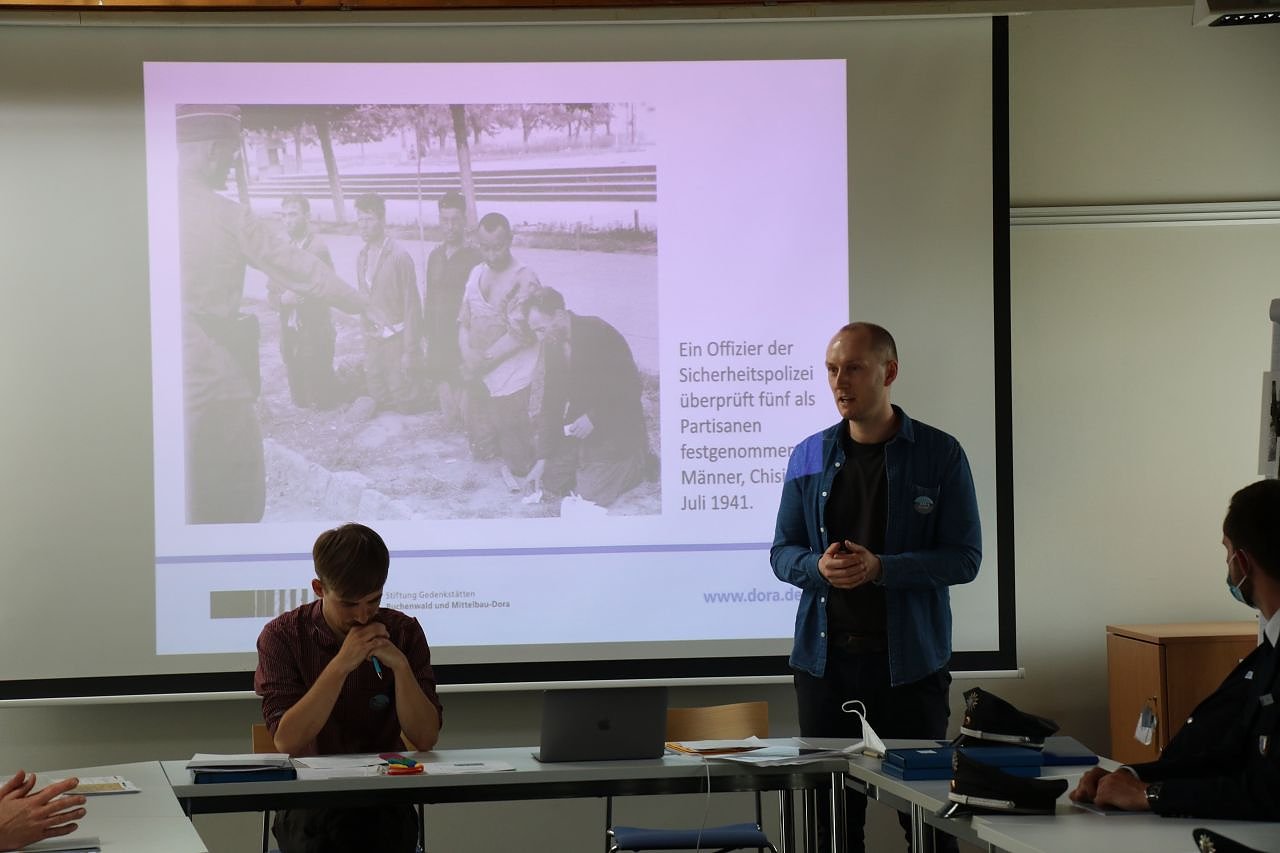 Zwei bis vier Tage arbeiten die Polizeischülerinnen und -schüler am historischen Ort und werfen selber einen Blick in die Quellenlage. Etwa am Beispiel von Rene D’Halluin, der in Frankreich am 23.7.1944 von der Straße weg zur Zwangsarbeit verpflichtet wird. Eingesetzt wird er in der Nordwerken AG in Nordhausen. Weniger als einen Monat später wird er seinen Arbeitsplatz verlassen um nach Hause zurückzukehren und später bei Mühlhausen von der Polizei aufgegriffen. Einen Haftbefehl gibt es nicht, auch kein Verfahren. D’Halluin wird in das KZ-Ellrich Juliushütte, ein Außenlager Doras, gebracht und verstirbt hier im Januar 1945. Auch bei der Verfolgung von Partisanen, Exekutionen durch den Strick und schließlich bei Massenerschießungen sind im Laufe der Nazi-Diktatur normale Polizisten beteiligt.