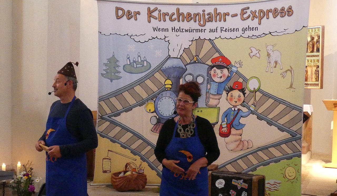 Gabi und Amadeus Eidner erfüllten mit Musik, Gesang und Spiel die Basilika Münchenlohra. Mit ihrem Kirchenjahres-Express machten sie Station an den größten Festtagen des Kirchenjahres. Da wurden doch tatsächlich am 24. Juni alle 4 Kerzen am Adventskranz angezündet. Auch die Sternsinger waren unterwegs und hatten sogar ein Kamel mitgebracht.