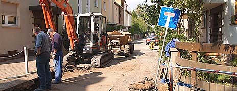 Die Bauarbeiter der Strabag werden zunächst die Trinkwasserleitung in der Straße verlegen. Dazu wurde die Strasse in Abschnitte unterteilt, die rund 12 Meter lang sind. Neben der Hauptleitung sollen die in diesem Bereich befindlichen Hausanschlussleitungen erneuert werden. Dann wird der Abschnitt zugemacht und die nächsten 12 Meter sind dran. Und so werden sich die Männer mit ihren Geräten weiter vorarbeiten – in Richtung Thomas-Mann-Strasse.