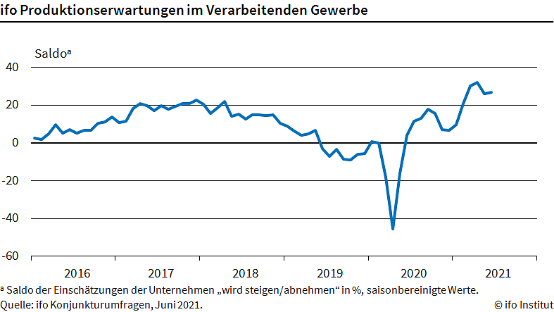 Die Produktionserwartungen im Verarbeitenden Gewerbe bleiben im Juni auf hohem Niveau. Der Indikator stieg auf 27 Punkte, nach 26 im Mai. Das geht aus der jüngsten Konjunkturumfrage des ifo Instituts hervor...