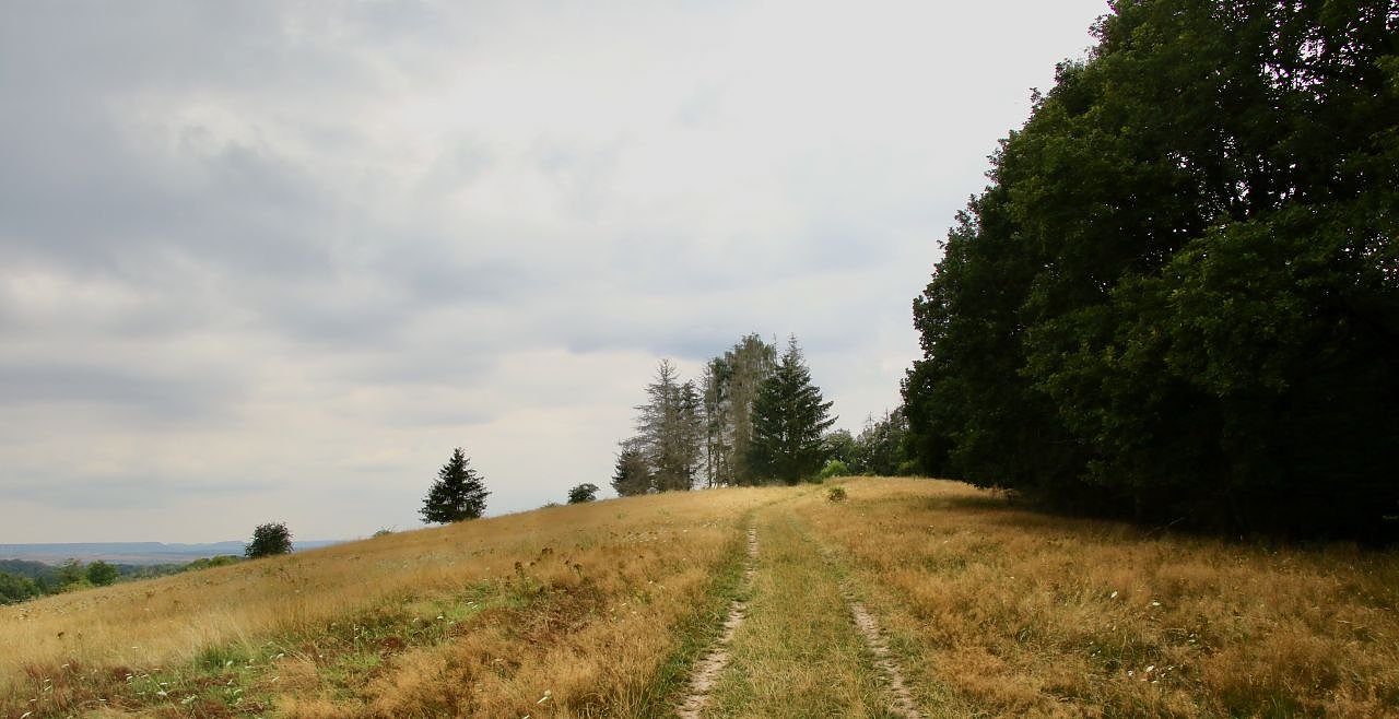Der Pfad führt zunächst über Feldwege den Berg hinauf und an satten Wiesen vorbei in Richtung Wald. Ein richtiger "Urwald" ist der im eigentlichen Sinne noch nicht, er soll es aber einmal werden. Der Wald zwischen Rüdigsdorfer Schweiz und Harzfelder Holz gehört zu den fünf Prozent der Thüringer Waldflächen, die vom Freistaat aus der wirtschaftlichen Nutzung genommen wurden und zu "Urwäldern von morgen" werden sollen.