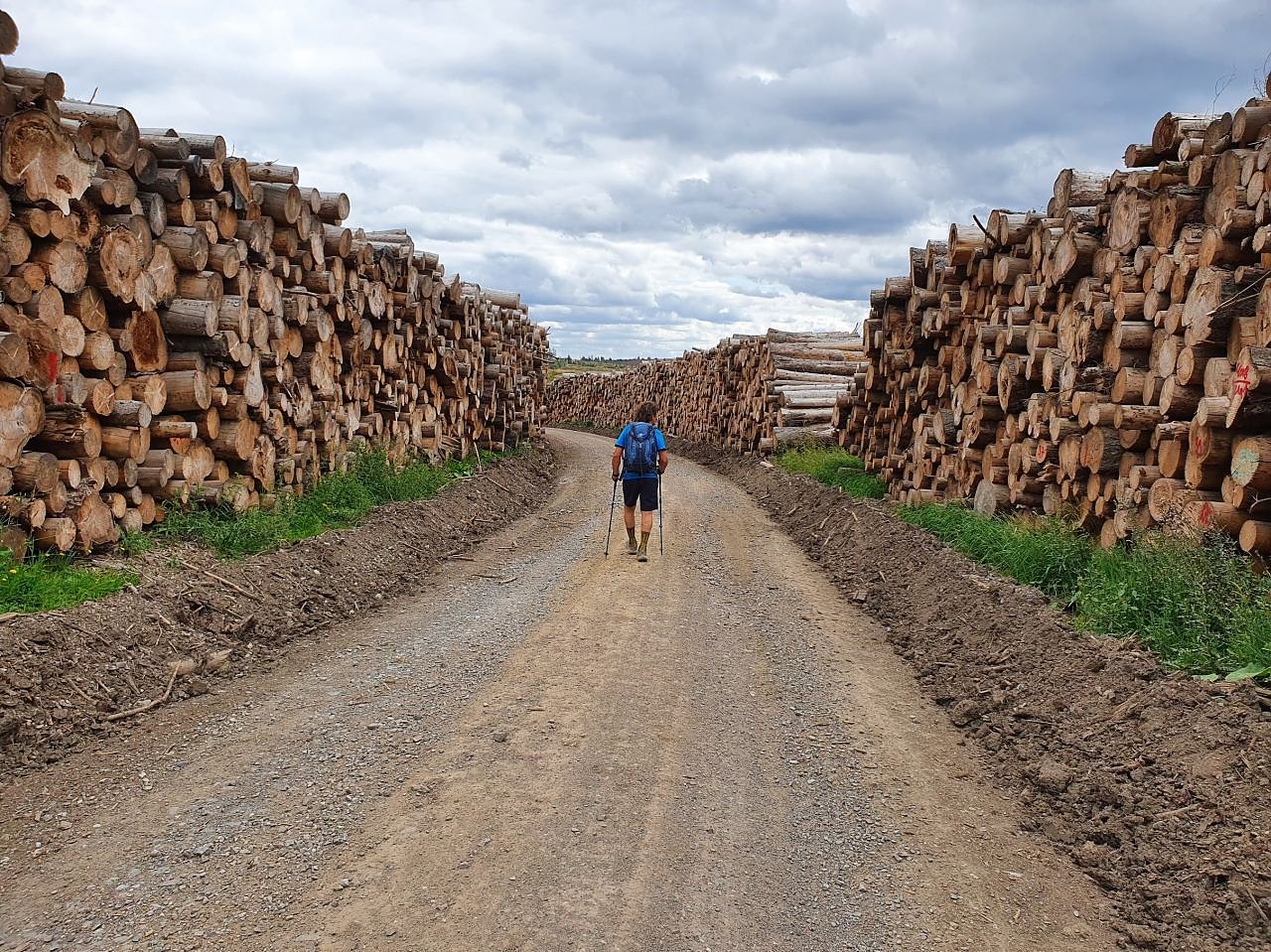 Nicht auszudenken, was uns auf den rund 25 Kilometern ohne Wald ab Königshütte bei Temperaturen von 30 und mehr Grad erwartet hätte. Das kannten wir ja schon aus den Jahren 2018 bis 2020 auf derselben Tour. Nur mit dem Unterschied, dass im aktuellen Jahr noch weniger Fichtenwald vorhanden ist, vor allem auf den letzten Kilometern vor Trautenstein. Kilometerweit konnten wir in Ermangelung von Bäumen unsere Route einsehen, ich fühlte mich zurückversetzt in das tschechische Isergebirge der 80er Jahre, das dem Schwefeldioxid vor allem aus den DDR-Braunkohlenschloten zum Opfer gefallen war. Hunderte Meter wurden die Wege mitunter von abgelagertem Stammholz gesäumt.