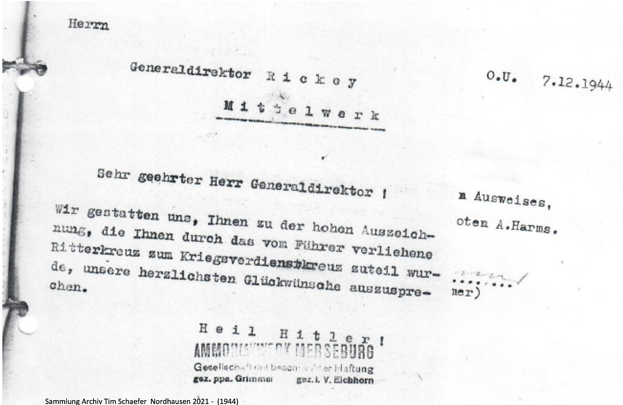 Wir alle wissen, dass diese Produktion auf dem Rücken der KZ-Häftlinge des Konzentrationslagers Mittelbau, unter den grauenhaften Bedingungen der NS- Zwangsarbeit, organisiert worden ist. Nur Herr Dr. Rickhey wusste nach 1945 davon so gut wie nichts mehr. Natürlich auch, um sich selbst zu schützen. Die Abbildung anbei zeigt ein Glückwunschschreiben vom 07.12.1944 des Ammoniakwerk Merseburg (IG Farben).