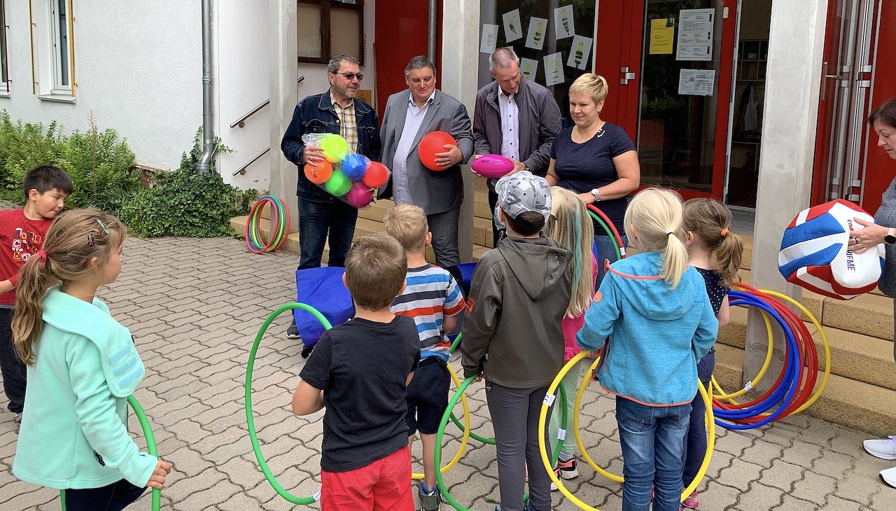 Übergabe der Bälle und Reifen durch Jens Niedergesäss und Andreas Meyer (hinten, 2. und 3. v.l.) (Foto: Kerstin Herzog)