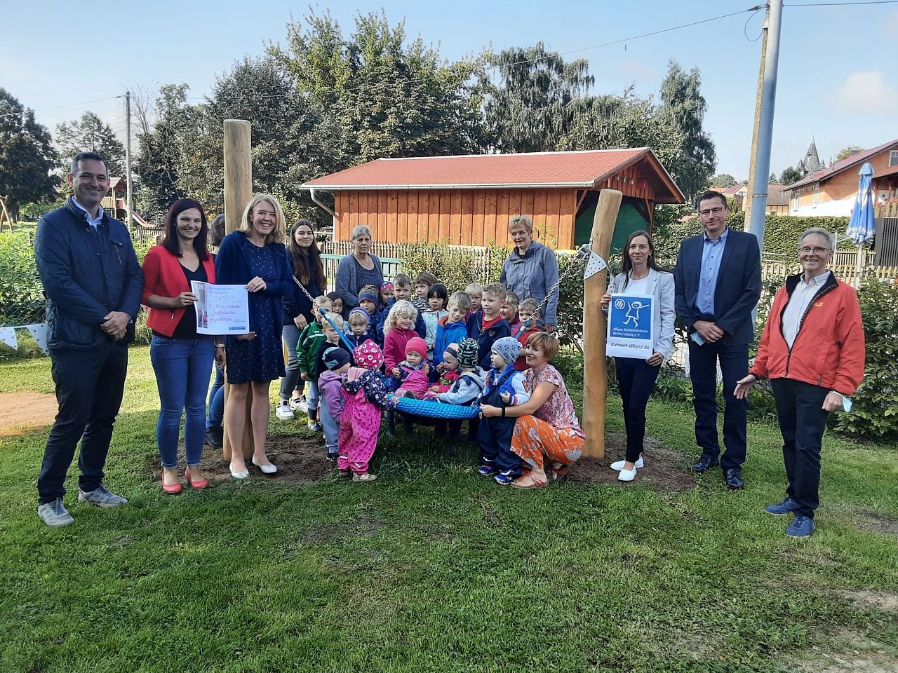 Die Kinder und Erzieher der Einrichtung Kleine Entdecker in Großwechsungen bedanken sich bei Mirjam Dahnert Allianz Hauptvertretung in Mackenrode sowie bei dem Allianz Kinderhilfsfonds Berlin/Leipzig für die Unterstützung der Nestschaukel.
